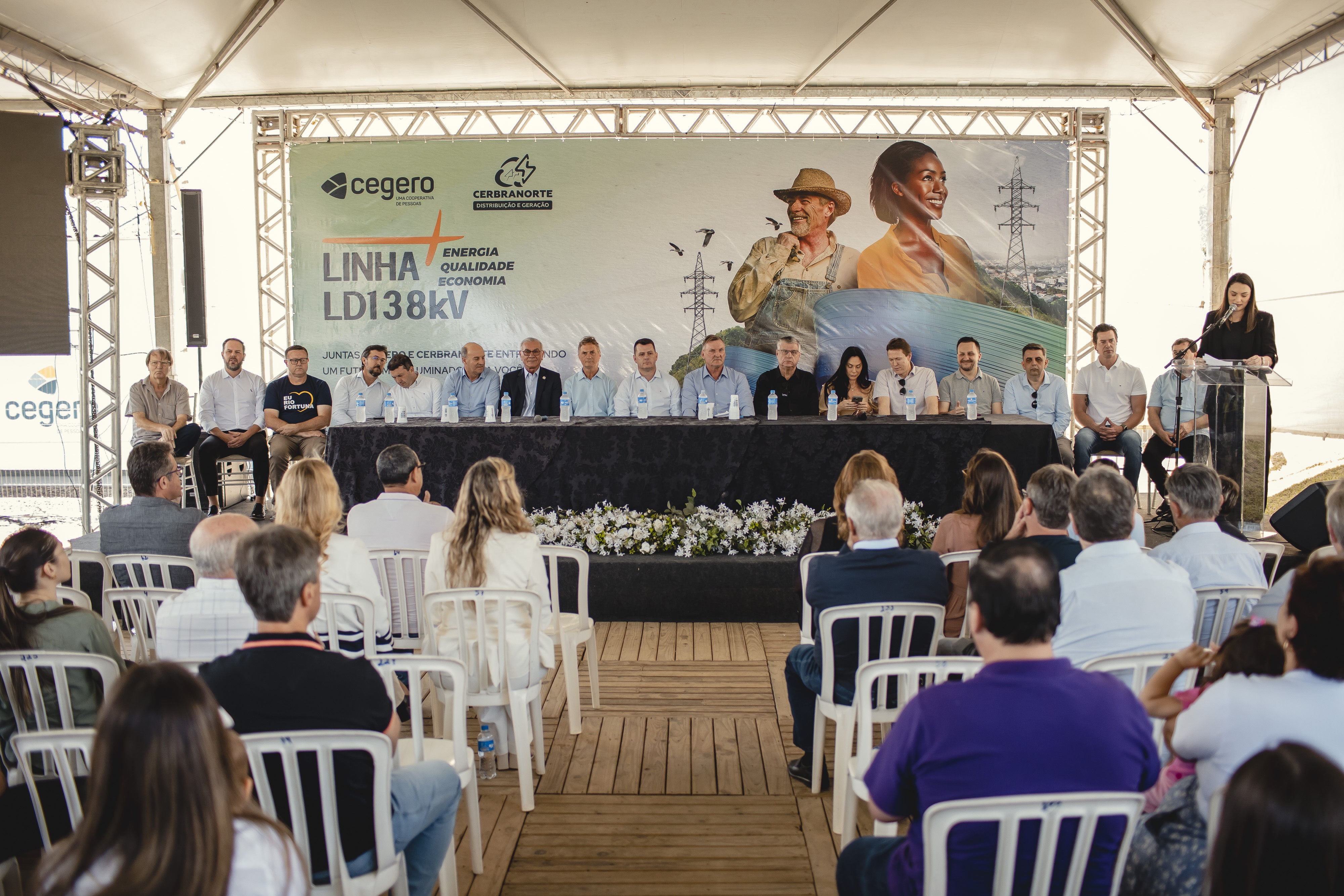 Entre as lideranças cooperativistas e autoridades públicas que marcaram presença na inauguração da nova Linha de Distribuição/Transmissão de 138 kV (LD138kV) e ocuparam lugar de destaque estão o secretário de Estado da Indústria, Comércio e Serviços, Silvio Dreveck, no ato representando o governador de Santa Catarina, Jorginho Mello; o presidente da Fecoerusc (Federação das Cooperativas de Energia do Estado de Santa Catarina), Edson Flores da Cunha; o vice-presidente da Ocesc (Organização das Cooperativas do Estado de Santa Catarina), Patrique Alencar Homem; os deputados estaduais Volnei Weber, José Milton Scheffer, Pepê Collaço e Camilo Martins; e a deputada federal Geovania de Sá. Também prestigiaram o ato solene e ocuparam assento na mesa principal os prefeitos de Braço do Norte e de São Ludgero, Lauro Boeing e Paulo Sérgio Lorenzetti; de Rio Fortuna, Lindomar Ballmann; o presidente da Cerbranorte Geração, Carlos Becker Fornazza; e os ex-presidentes da Cegero e Cerbranorte, Francisco Niehues Neto e Mayco Luiz Niehues.